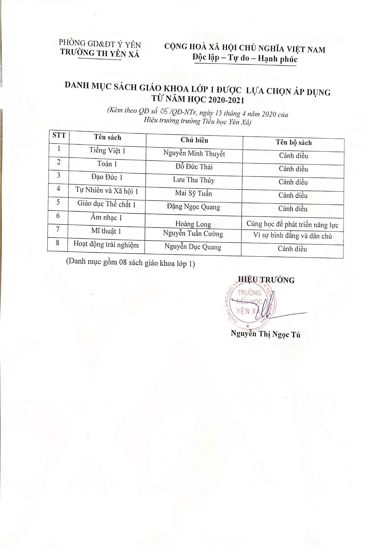 Danh mục sách giáo khoa lớp 1 được lựa chọn áp dụng từ năm học 2020-2021